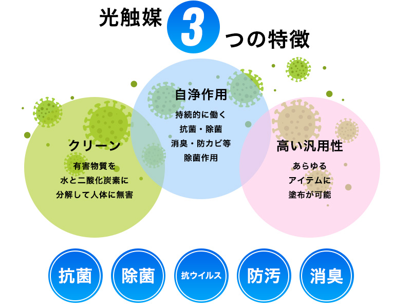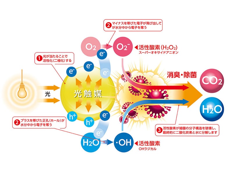 二酸化チタンは酸化分解能力が非常に高く付着した有害物質を持続的に二酸化炭素と水に分解できるといわれています。また、光触媒は環境にも優しく、人体へも無害とされています。